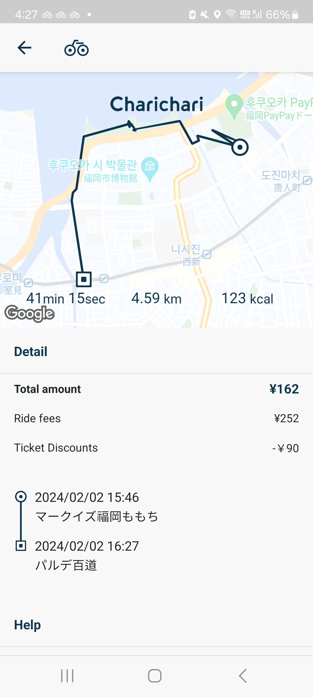 후쿠오카가 은근 자전거 타고 돌아다니기 좋네요. 공유 자전거 금액도 얼마 안 나왔습니다.